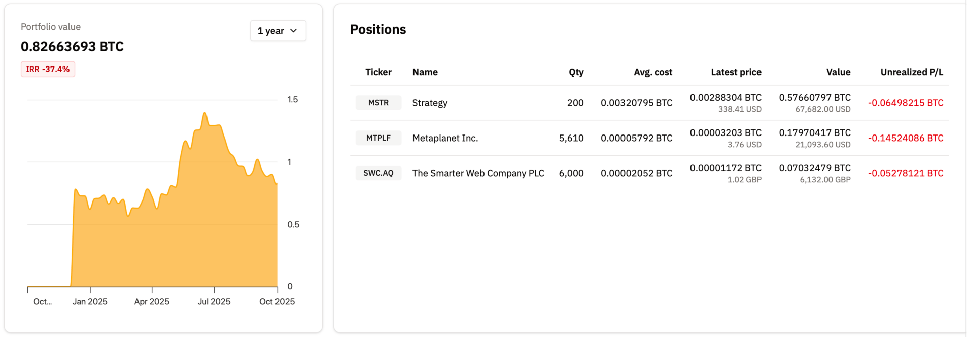 We’ve built a live Bitcoin Treasury portfolio tracker that shows live market value, unrealized P/L, and IRR over a specific time period. Every position updates in real time so you can watch discounts to mNAV widen or close as catalysts play out.