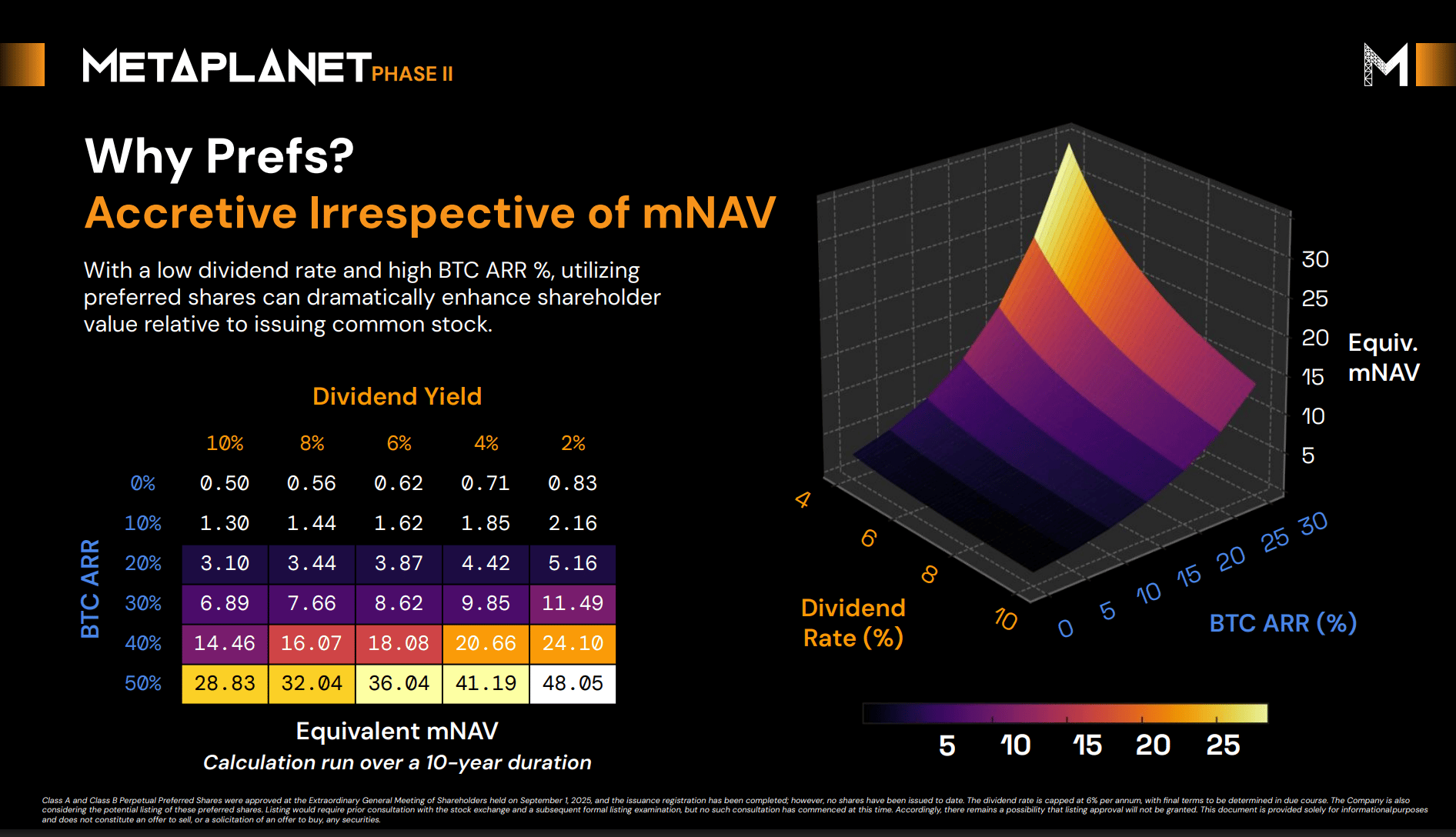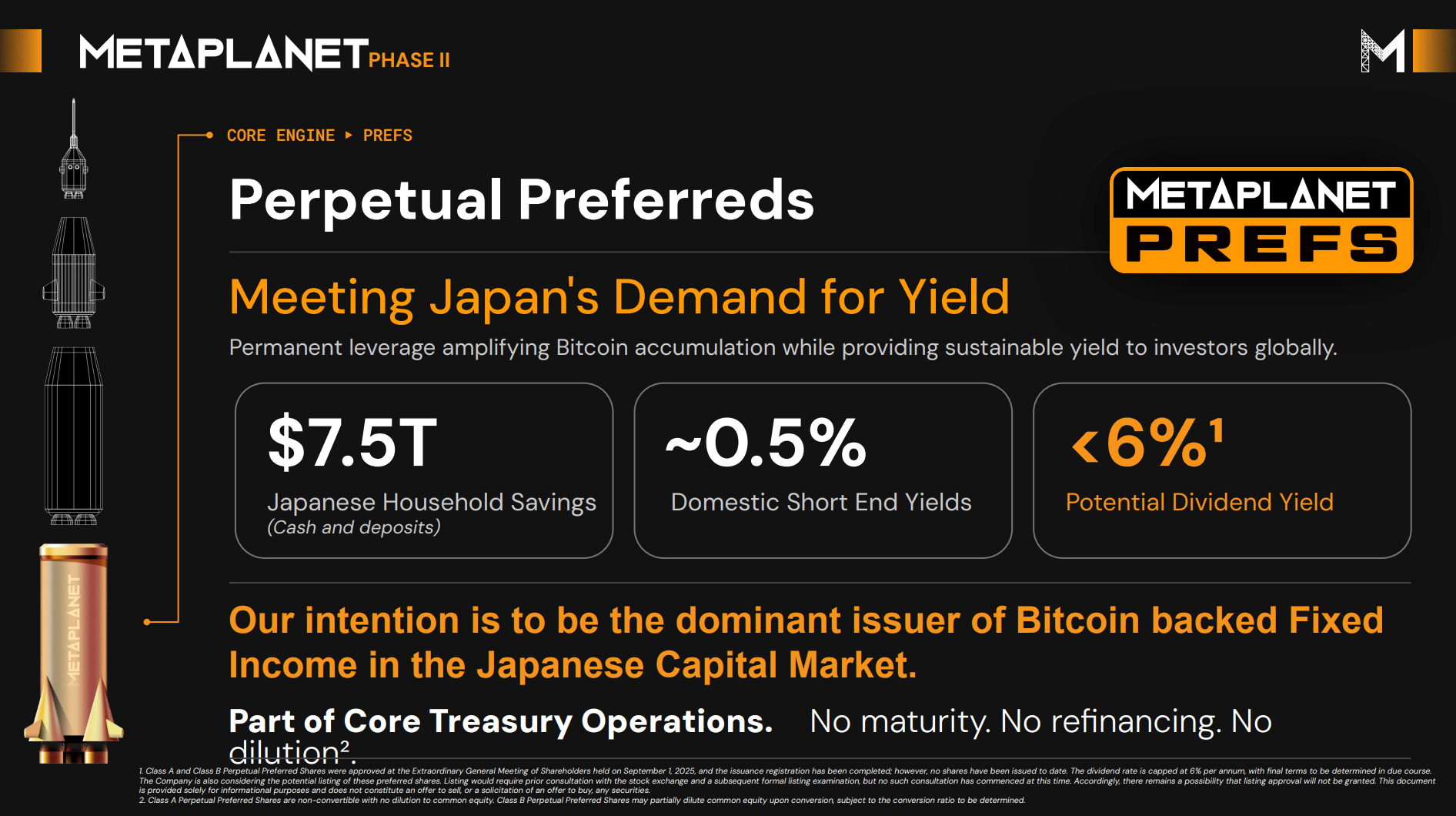 Moreover, Metaplanet’s mathematics are compelling. At 25% NAV target capacity, preferred issuance increases BTC yield without common equity dilution. The company explicitly states its intention to “be the dominant issuer of Bitcoin-backed Fixed Income in the Japanese Capital Market.”