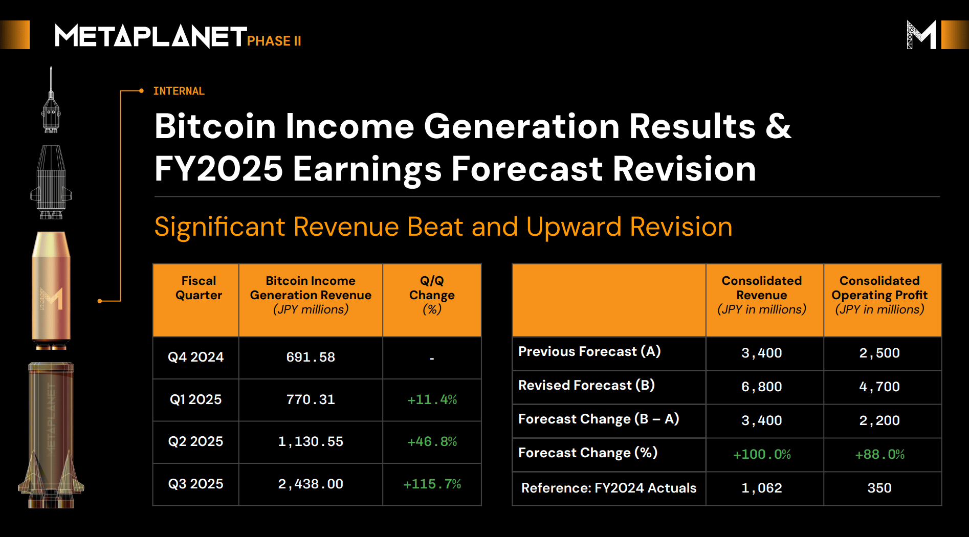 Indeed, Metaplanet’s Bitcoin play has already been paying off. According to the company, Bitcoin income generation has already delivered record Q3 2025 revenues of $16.25 million, up 115% quarter-over-quarter.