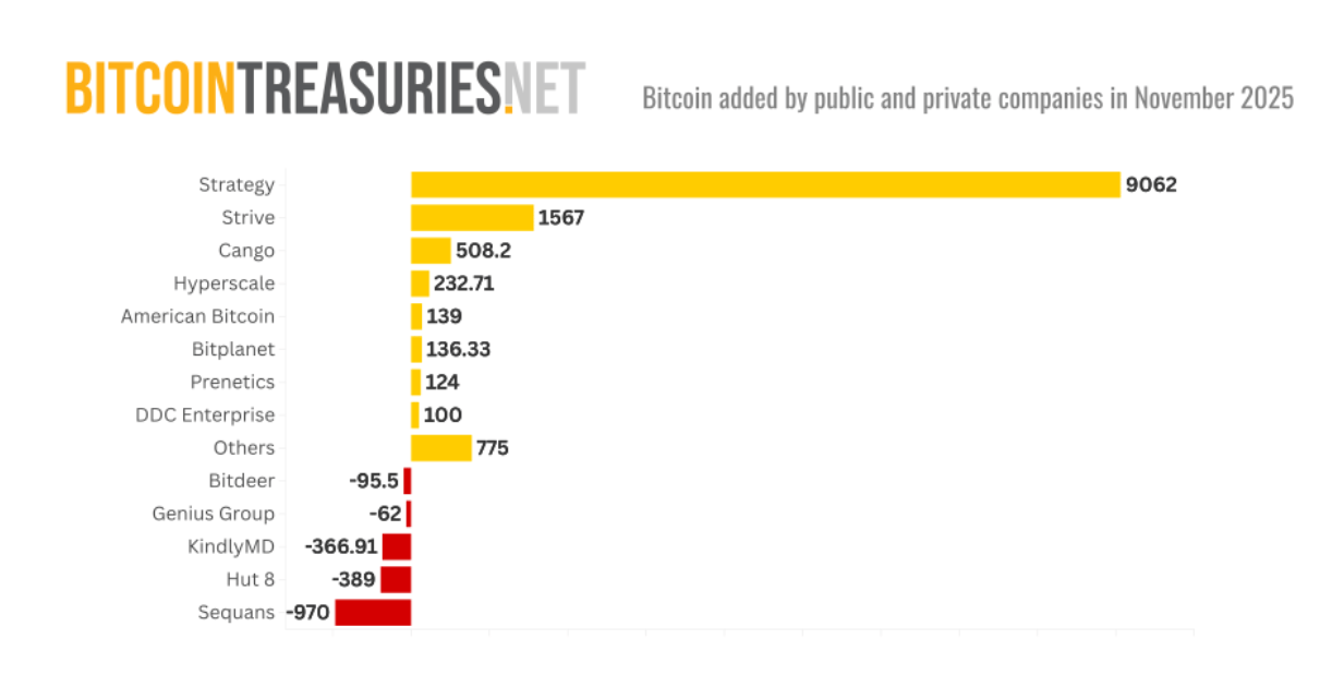November sales and holding reductions include Sequans (-970 BTC), Hut 8 (-389 BTC), KindlyMD (-366.91 BTC), Bitdeer (-95.5 BTC), and Genius Group (-62 BTC).